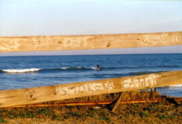In addition to the graffiti above on the wooden barrier at the 14th St. oceanfront dead-end, there was more wisdom inscribed on the seawall. My favorites were "Chad Can't Surf" and "Eric Shreds". The latter was later appended with "Lettuce". 14th St. was THE surf and gathering spot for the south Cocoa Beach crew throughout the 90s.